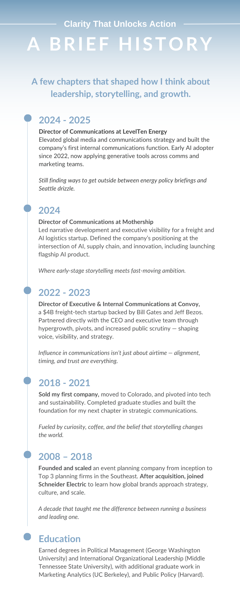Currently based in Seattle, I’ve worked with mission-driven organizations like LevelTen Energy, Convoy, and Mothership, helping translate complex ideas into messages that move markets, investors, and employees.